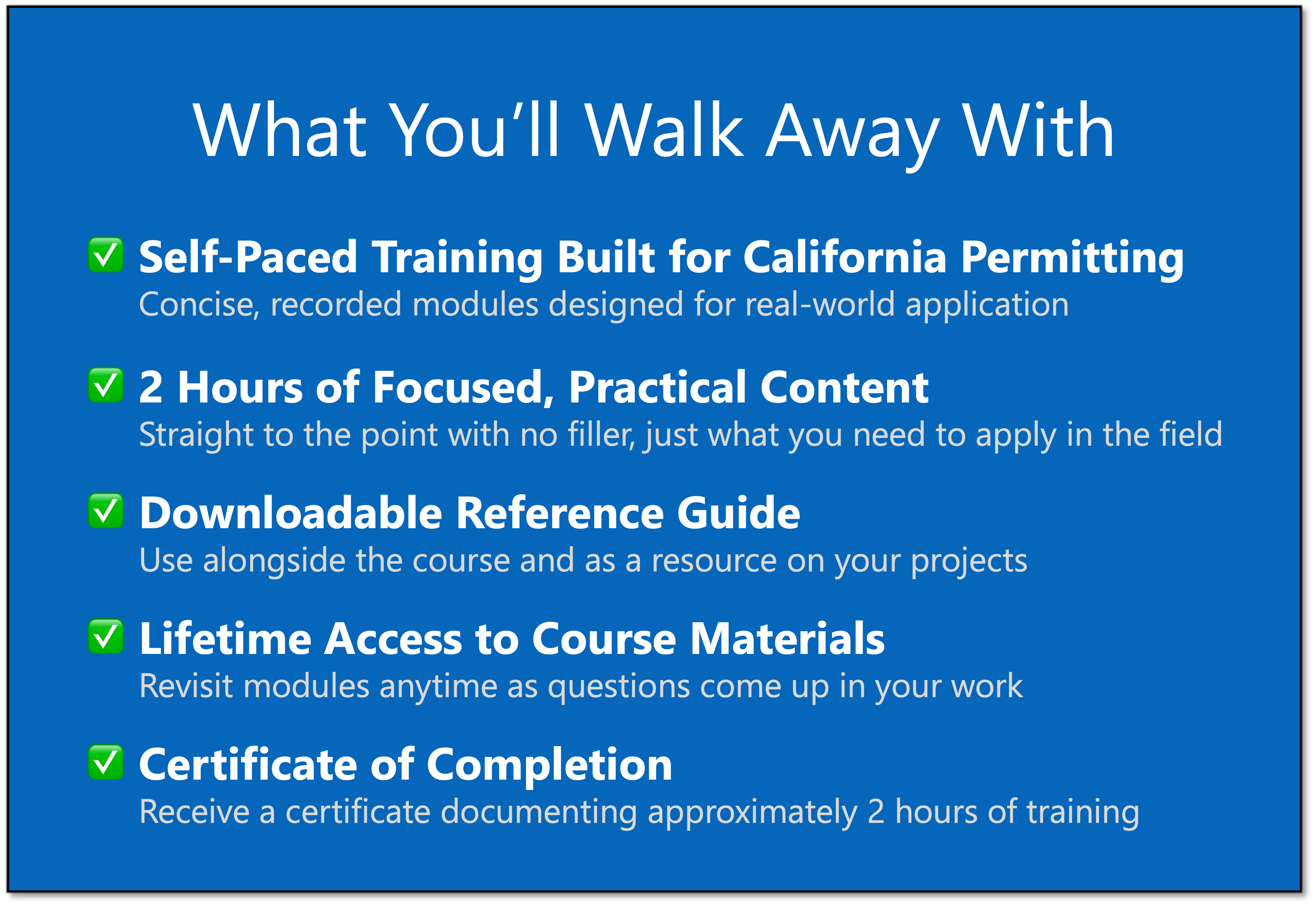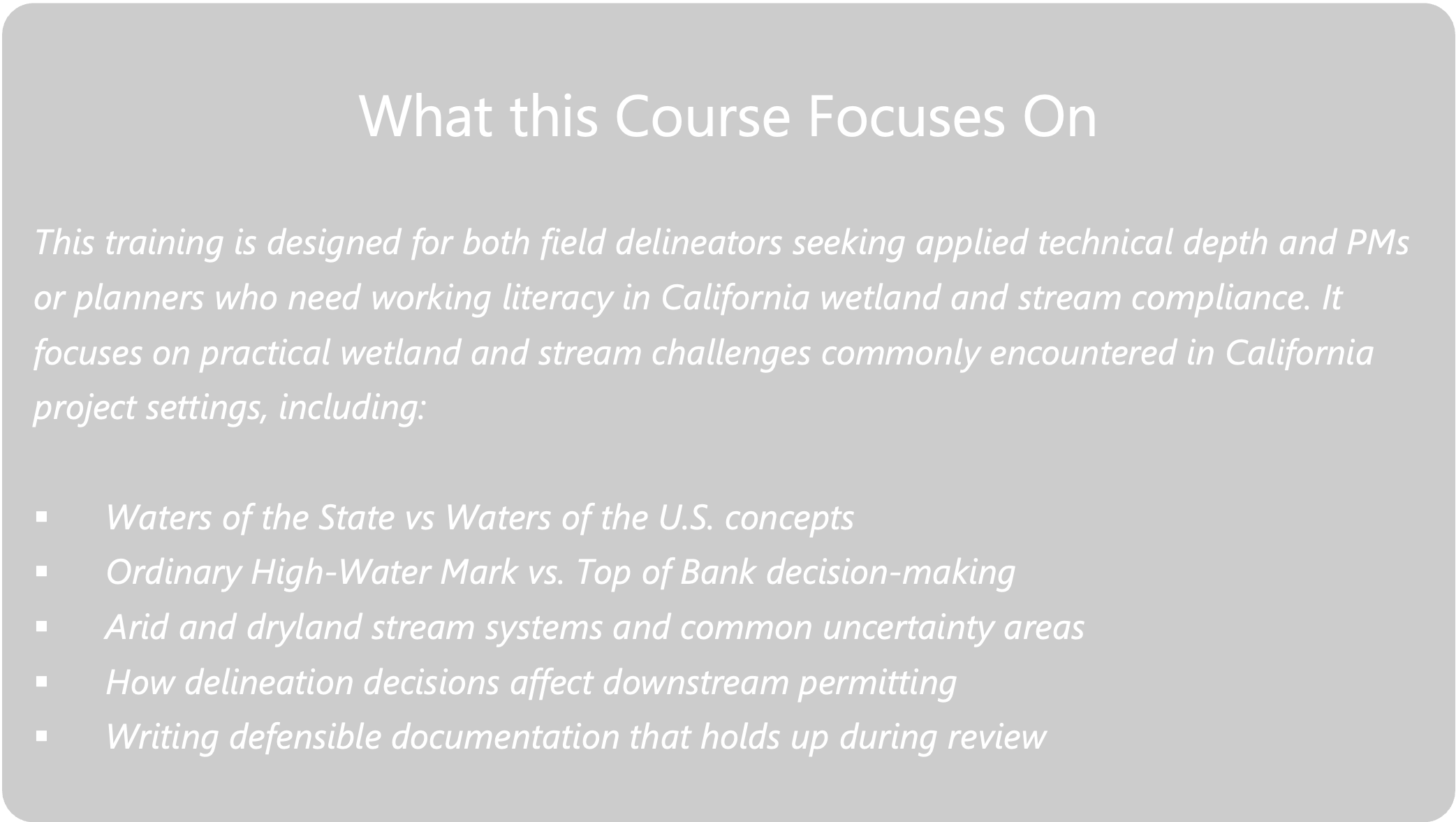 By the end of this course, you will be able to: - Identify likely federal and state jurisdictional triggers early in project development - Clearly map how 404, 401, 1602, and Porter-Cologne intersect - Structure application narratives that align with agency review criteria - Anticipate common agency concerns before submittal - Reduce avoidable comment cycles and delays - Write clear permit narratives and supporting documentation that withstand agency review